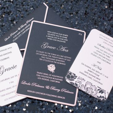 Every invitation tells a story and sets the tone for your special occasion. We will work with you to design a one-of-a- kind invitation. We specialize in weddings, mitzvahs & corporate invitations.